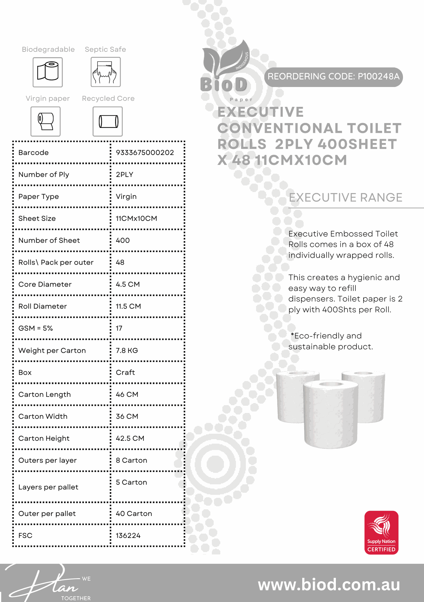 BIOD - EXECUTIVE CONVENTIONAL TOILET ROLLS 2PLY 400SHEET X 48 10CMX10CM