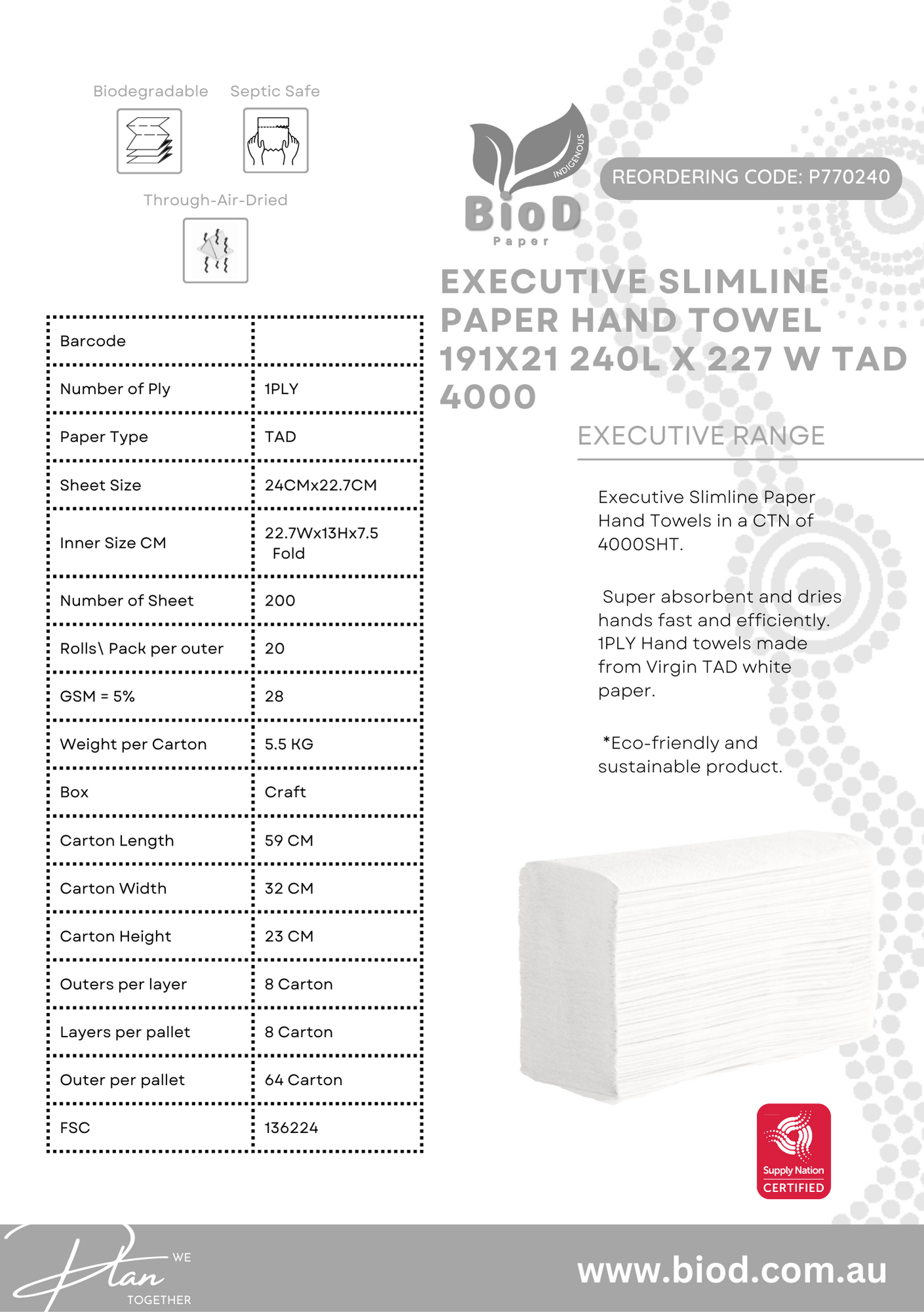BIOD - EXECUTIVE SLIMLINE PAPER HAND TOWEL 191X21 240L X 227 W TAD 4000