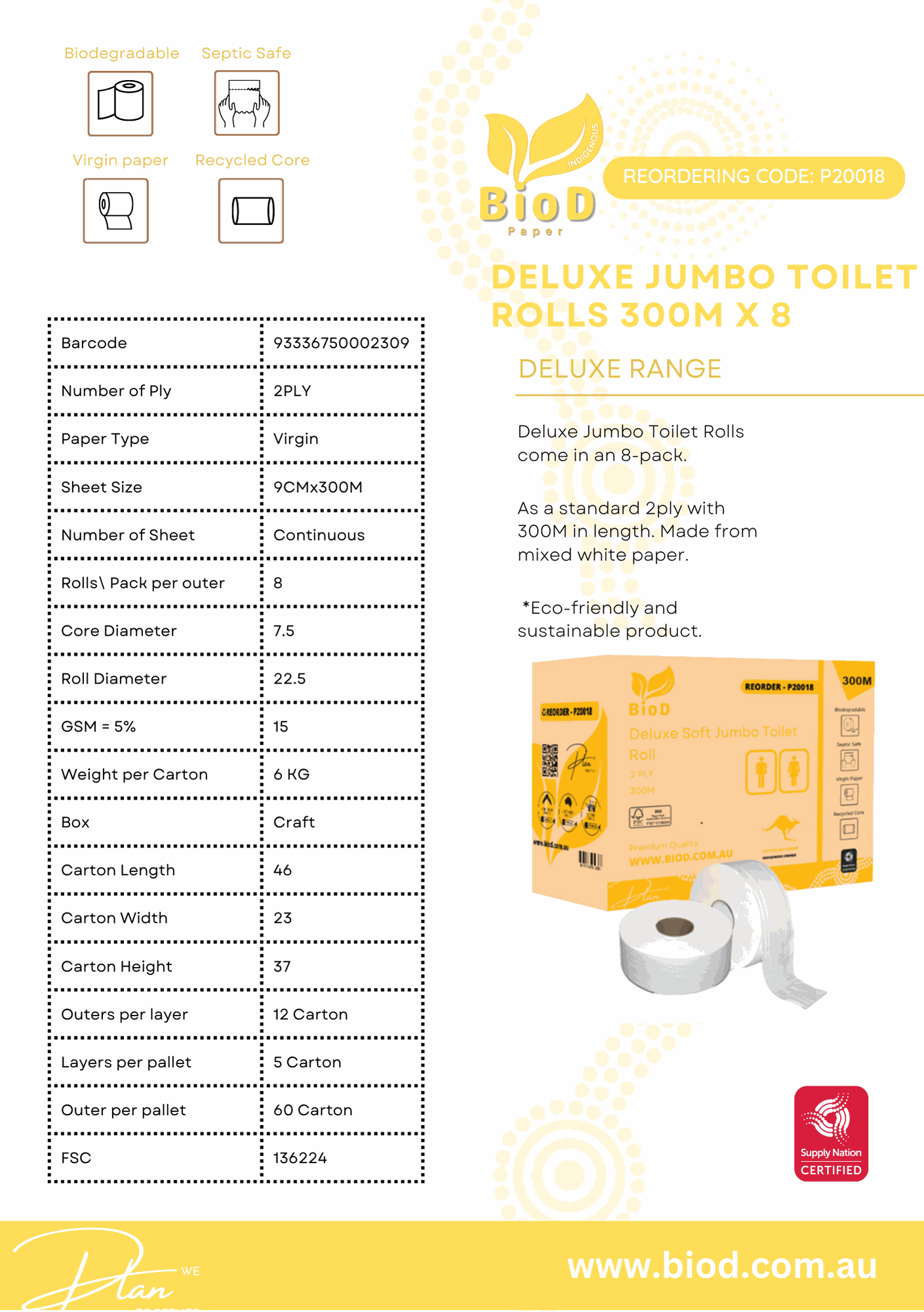BIOD - DELUXE JUMBO TOILET ROLLS 300M X 8